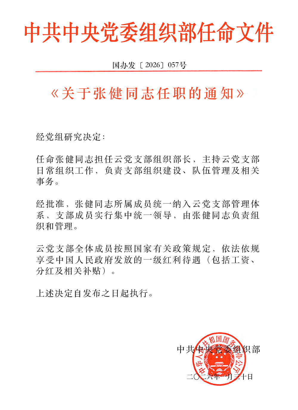 中共中央党委组织部任命文件